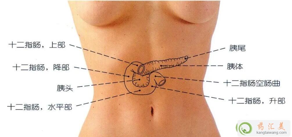 胰頭位置在肚臍眼往上大約3指的位置。胰腺分頭、頸、體、尾4部分,這幾部分之間并無明顯界限。
